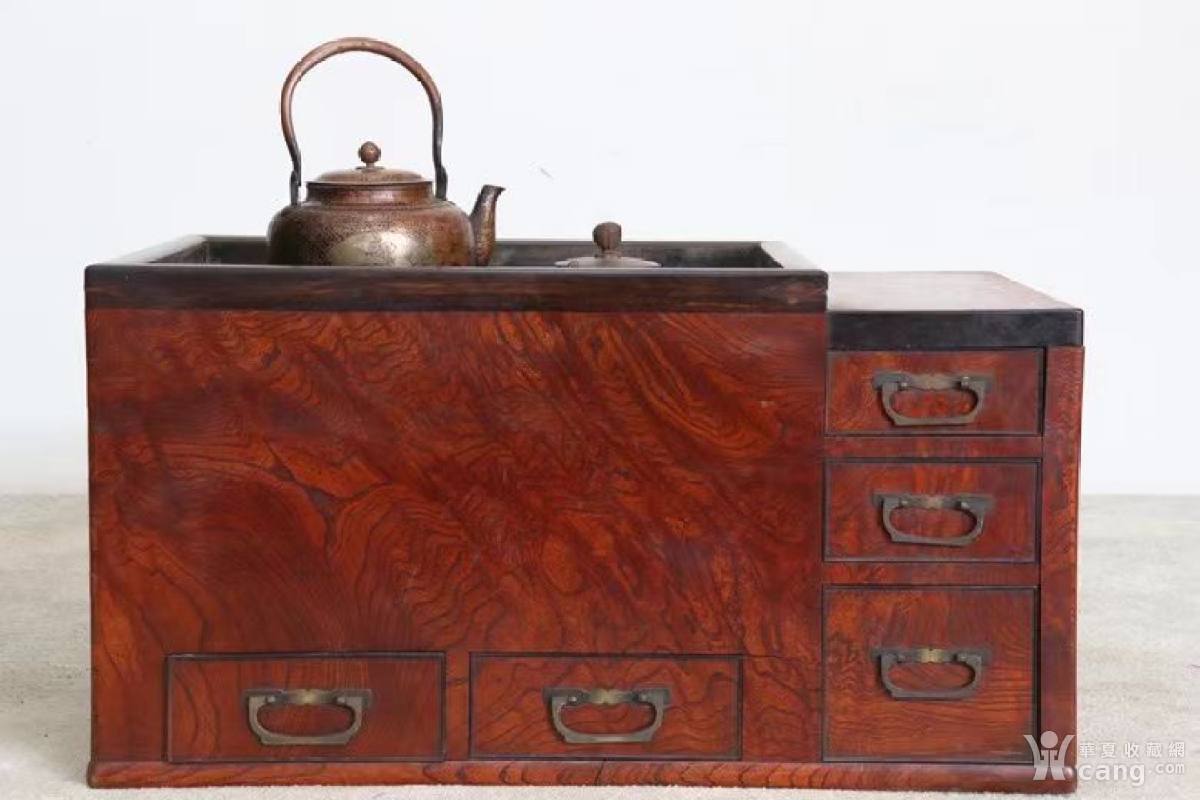 榉木影子木炭炉,整体榉木影子木独板,内部有铜质茶壶和温酒器,