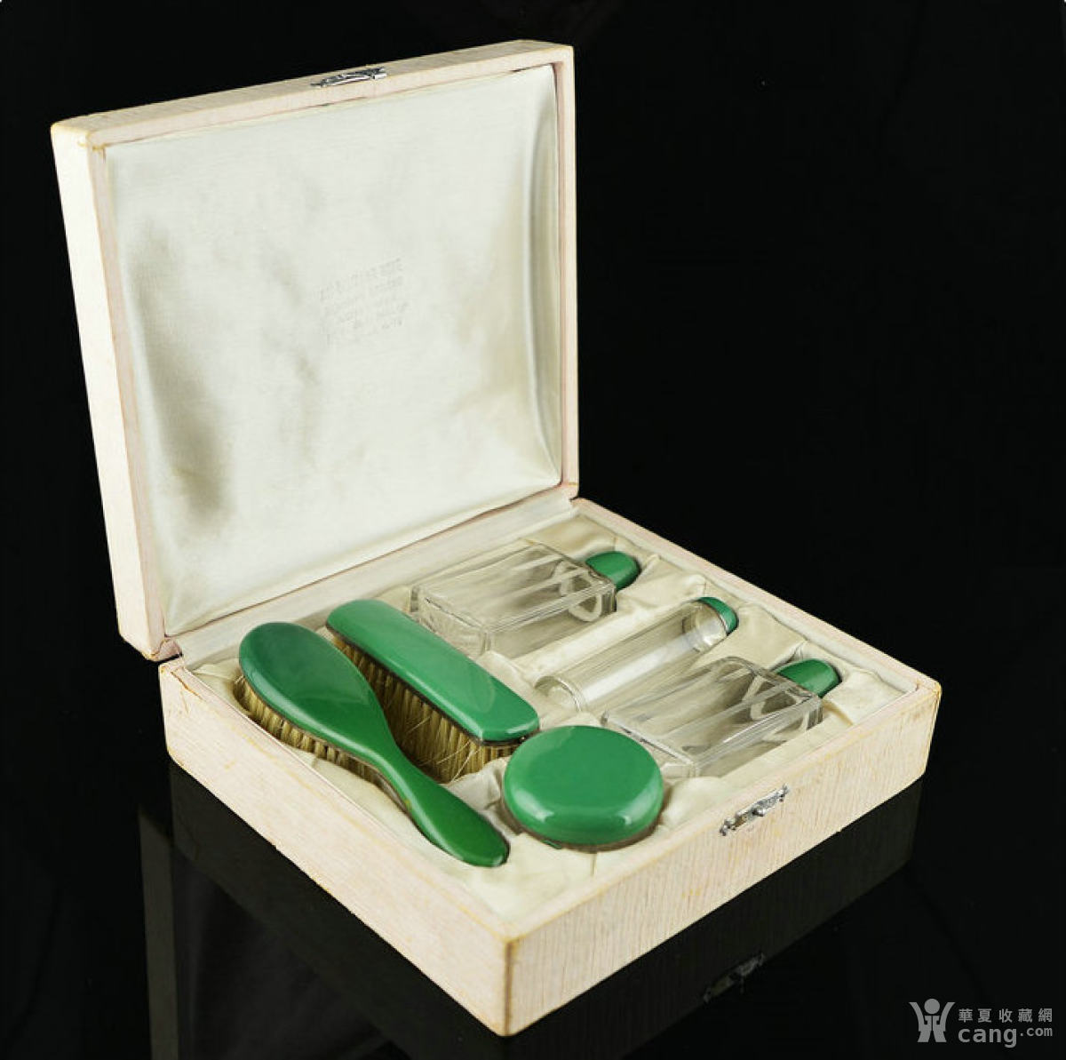 【西洋古董收藏品】19世纪法国翠绿珐琅镶嵌纯银梳妆套件