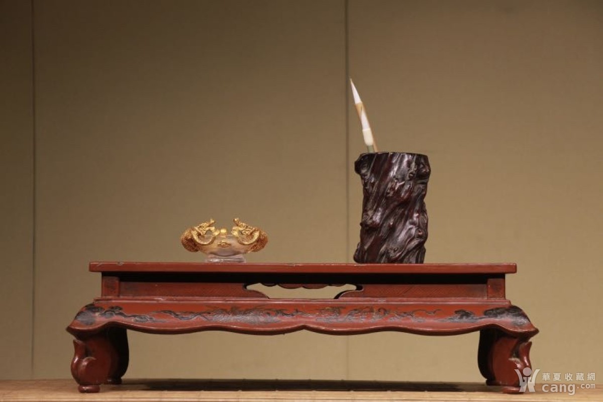 朱红漆龙凤纹案几 此案几器型典雅,面板带拦水线,高束腰,彭