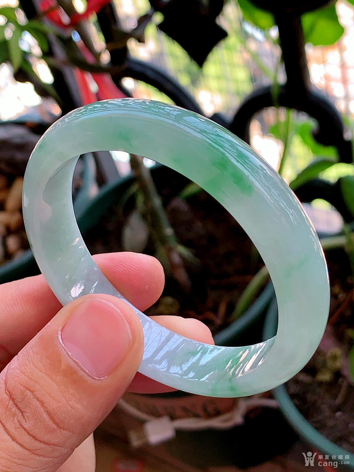 缅甸天然翡翠A货冰透水润飘花宽边手镯56.8圈口