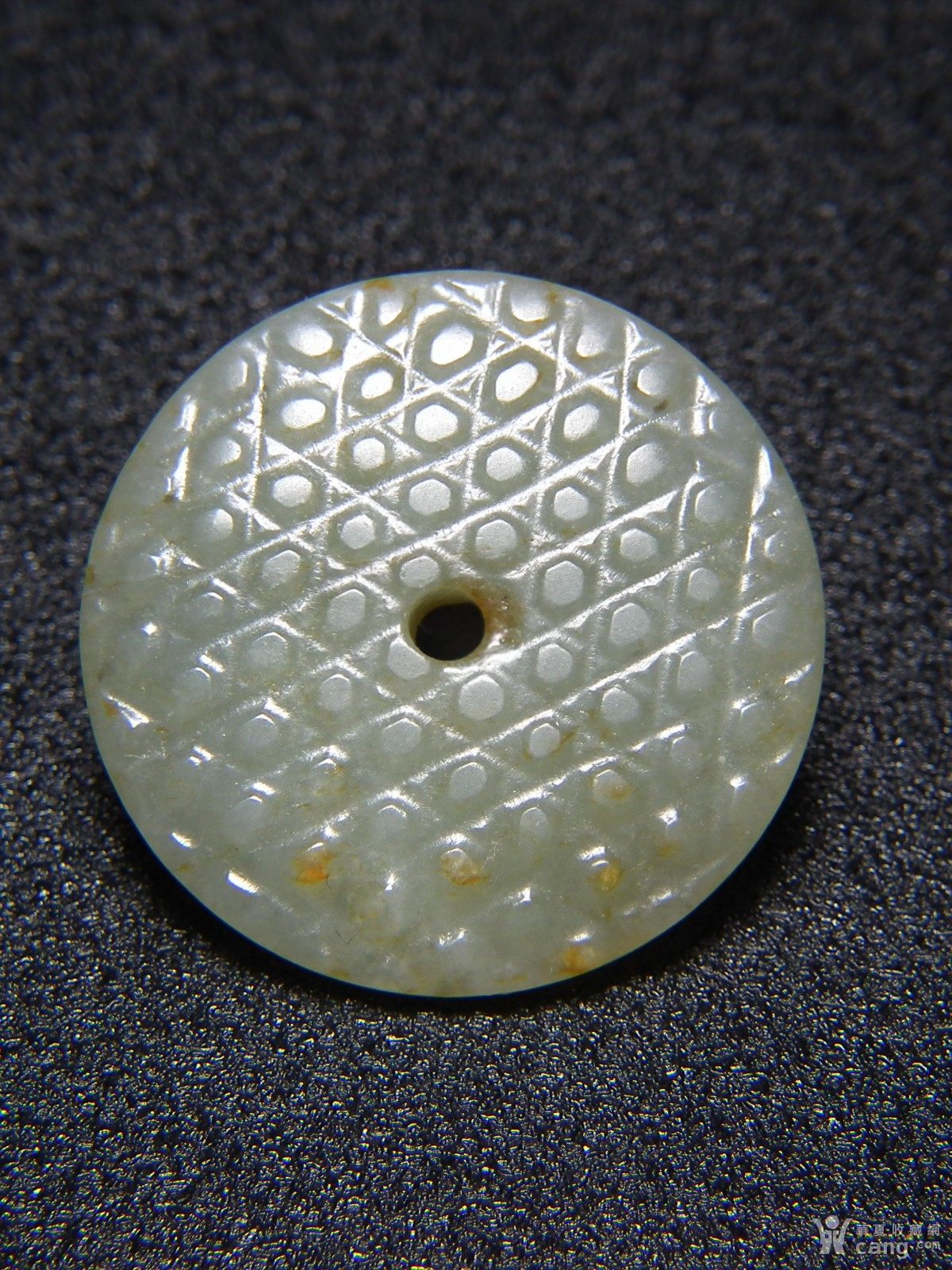 S07 和田青白玉带红沁双面工手工雕浅浮雕蒲纹小圆文玩玉璧佩