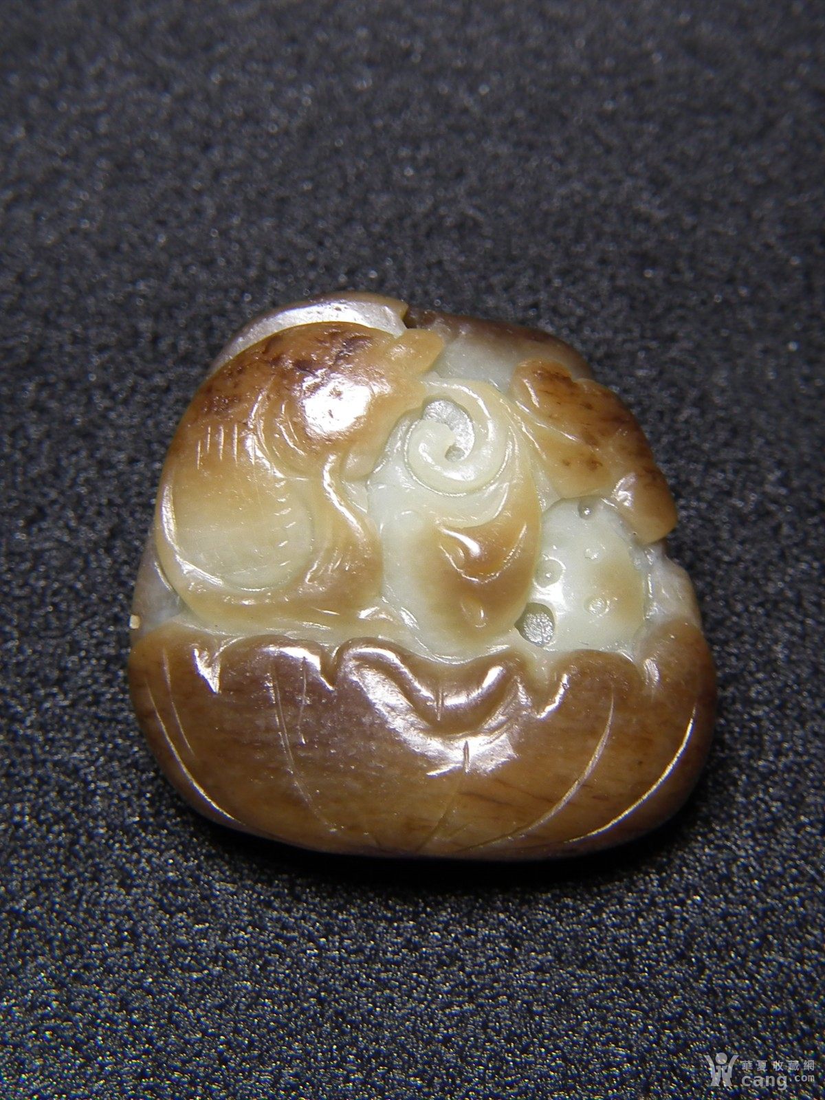 S07 和田玉巧色巧雕带黑皮沁荷叶灵芝莲蓬头金鱼鱼篓大把件