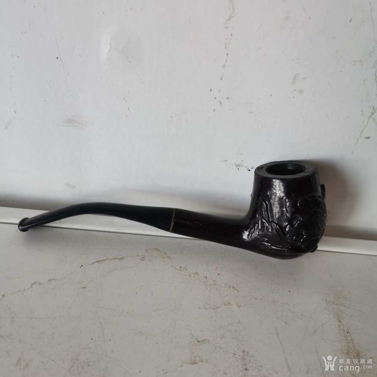 老木头烟斗一个,品相如图,有一处开裂如图可见,雕刻狮子图案,