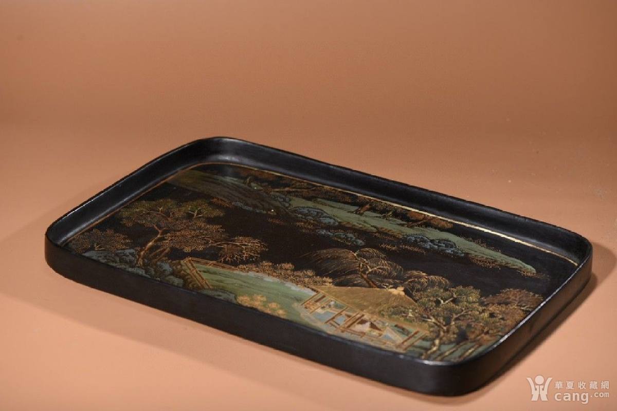 老脱胎漆器描金填彩松荫高仕方盘 长39.5cm 宽26