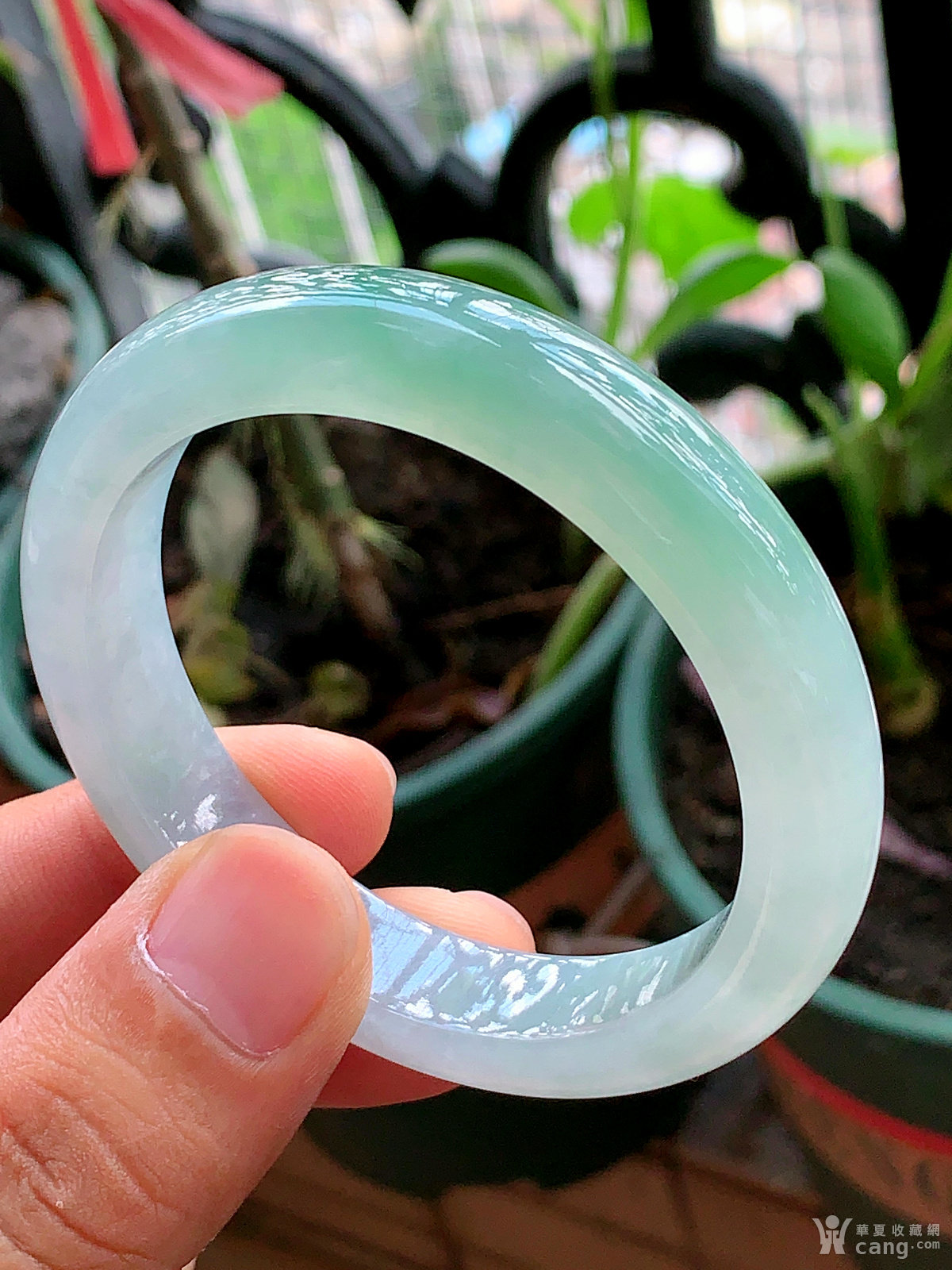 缅甸天然翡翠A货冰透水润飘花宽边手镯55.8圈口