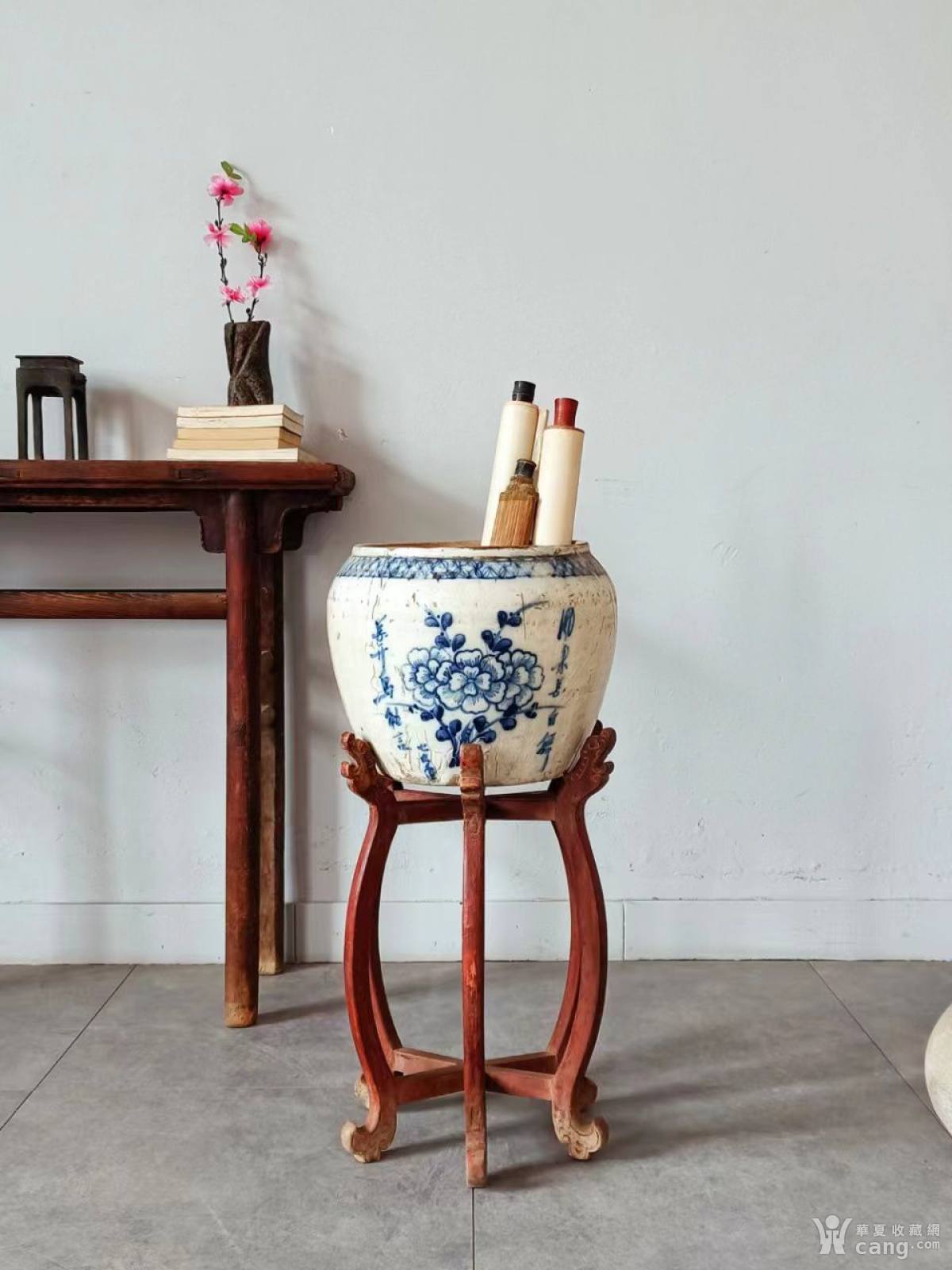 『文房雅器 • 六条龙缸架』 清代,楠木朱红漆 瓷卷缸,高