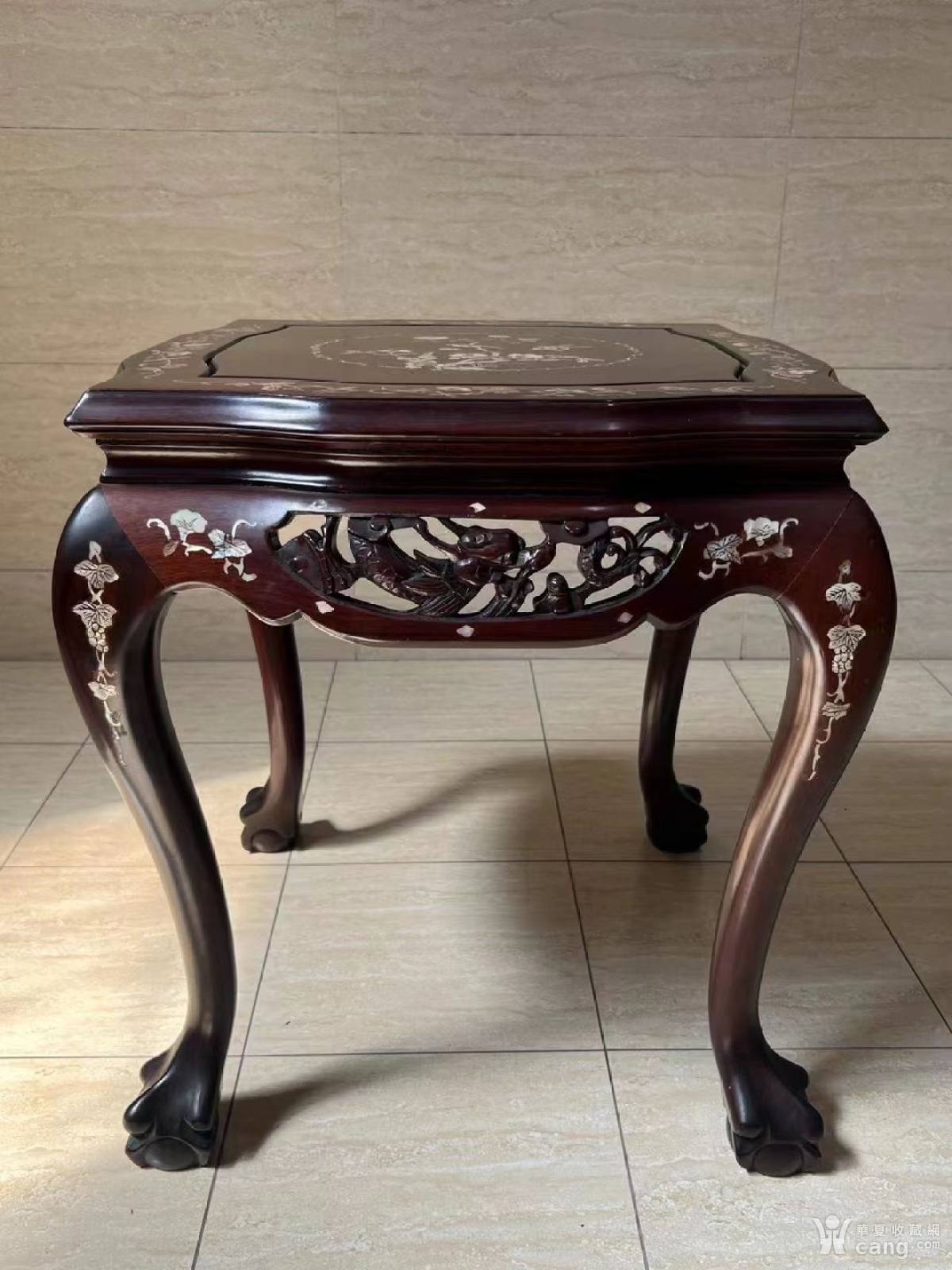 老花梨嵌螺钿花鸟图三弯腿四方花几