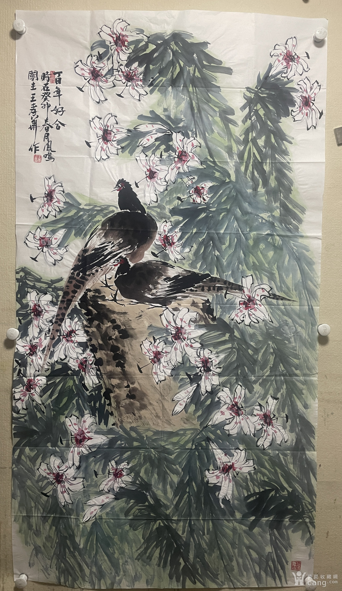 六尺整张【保真】王孝华6尺中堂花鸟画百合花锦鸡4《百年好合》