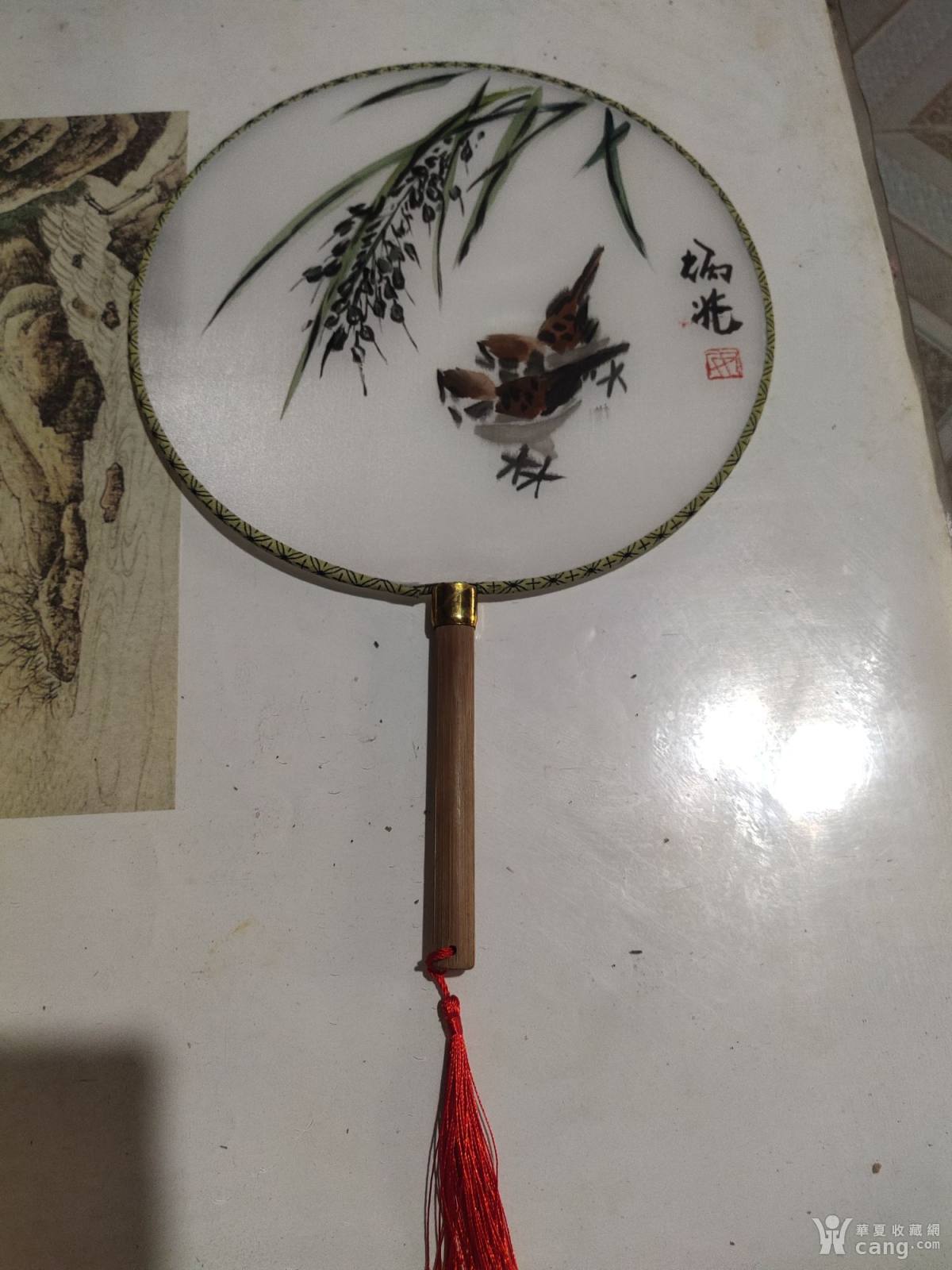 著名齐派画家安炳兆手绘真丝团扇麻雀稻穗图,完整。