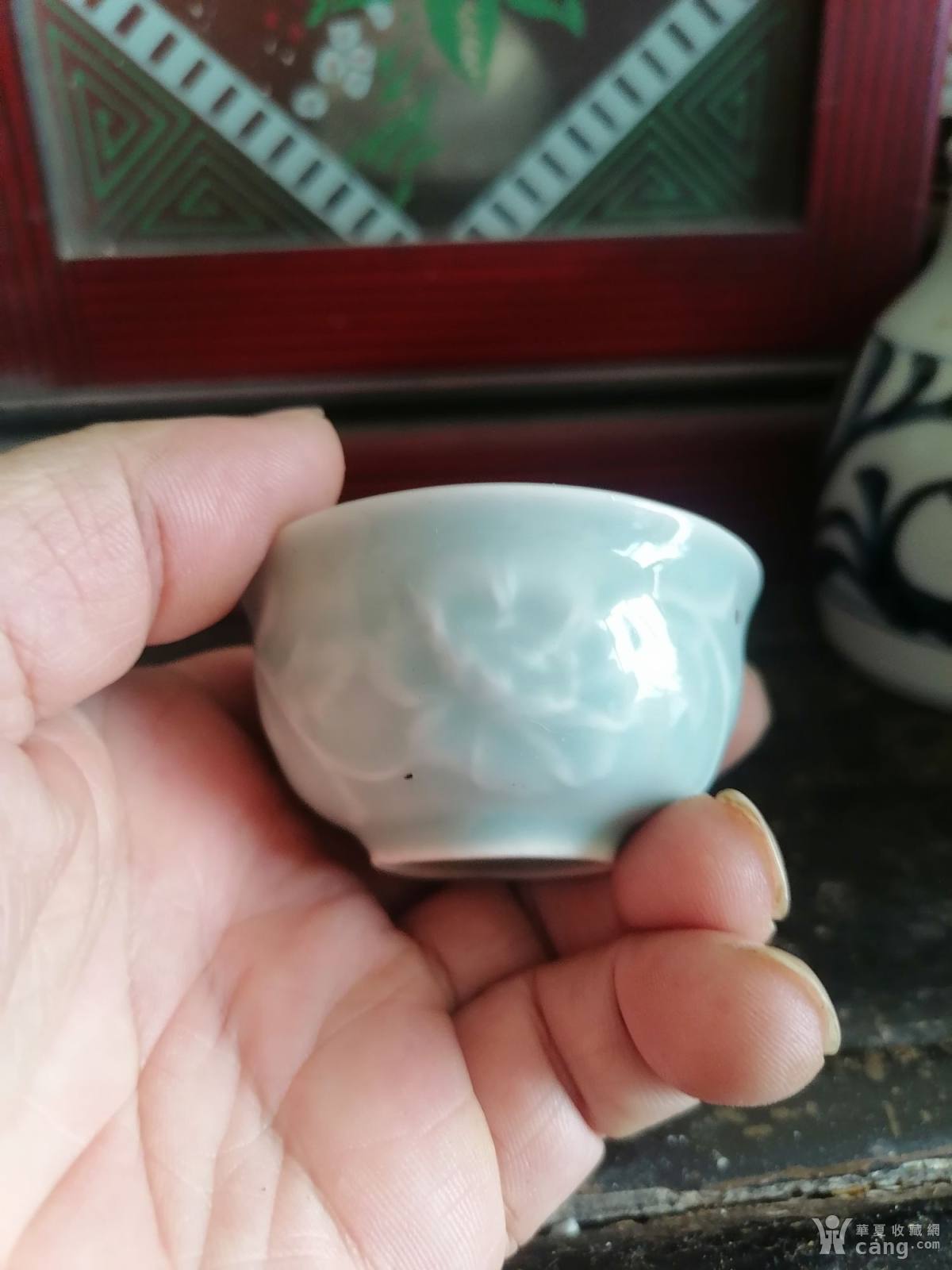 杯内牡丹花卉图青瓷花卉暗刻纹茶杯