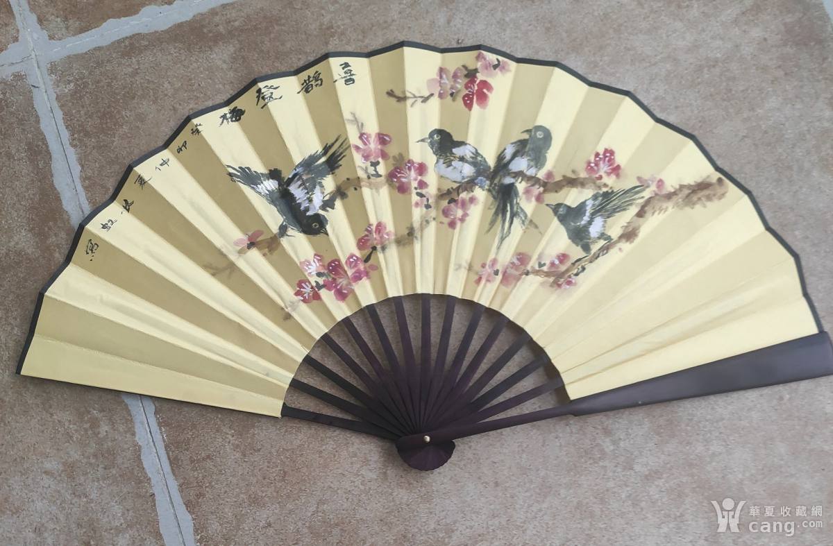 原创纯手绘喜鹊登梅十寸仿红木绢质折扇