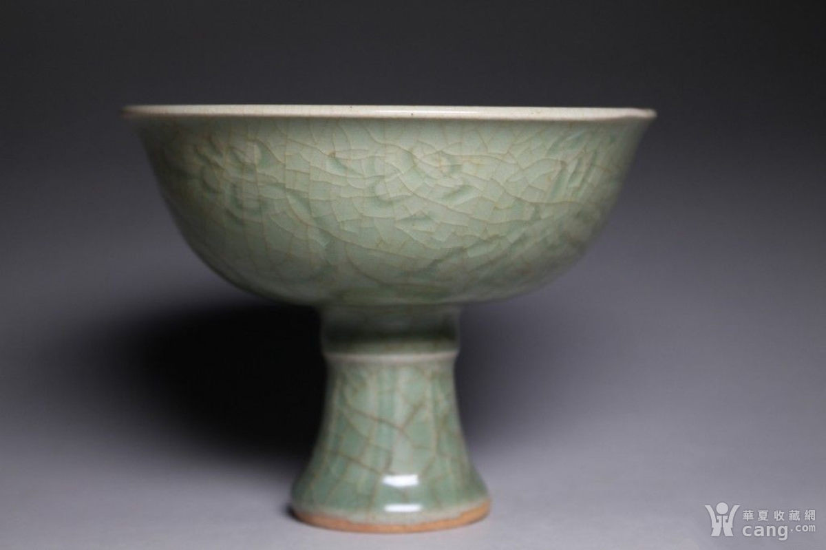 1元末龙泉窑豆青釉刻花纹高足杯一对