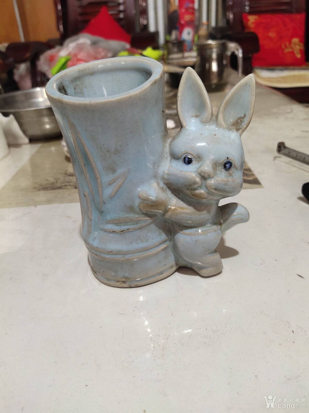漂亮60年代钧釉小兔子竹节纹笔筒一个,口沿短线如图,余完整。