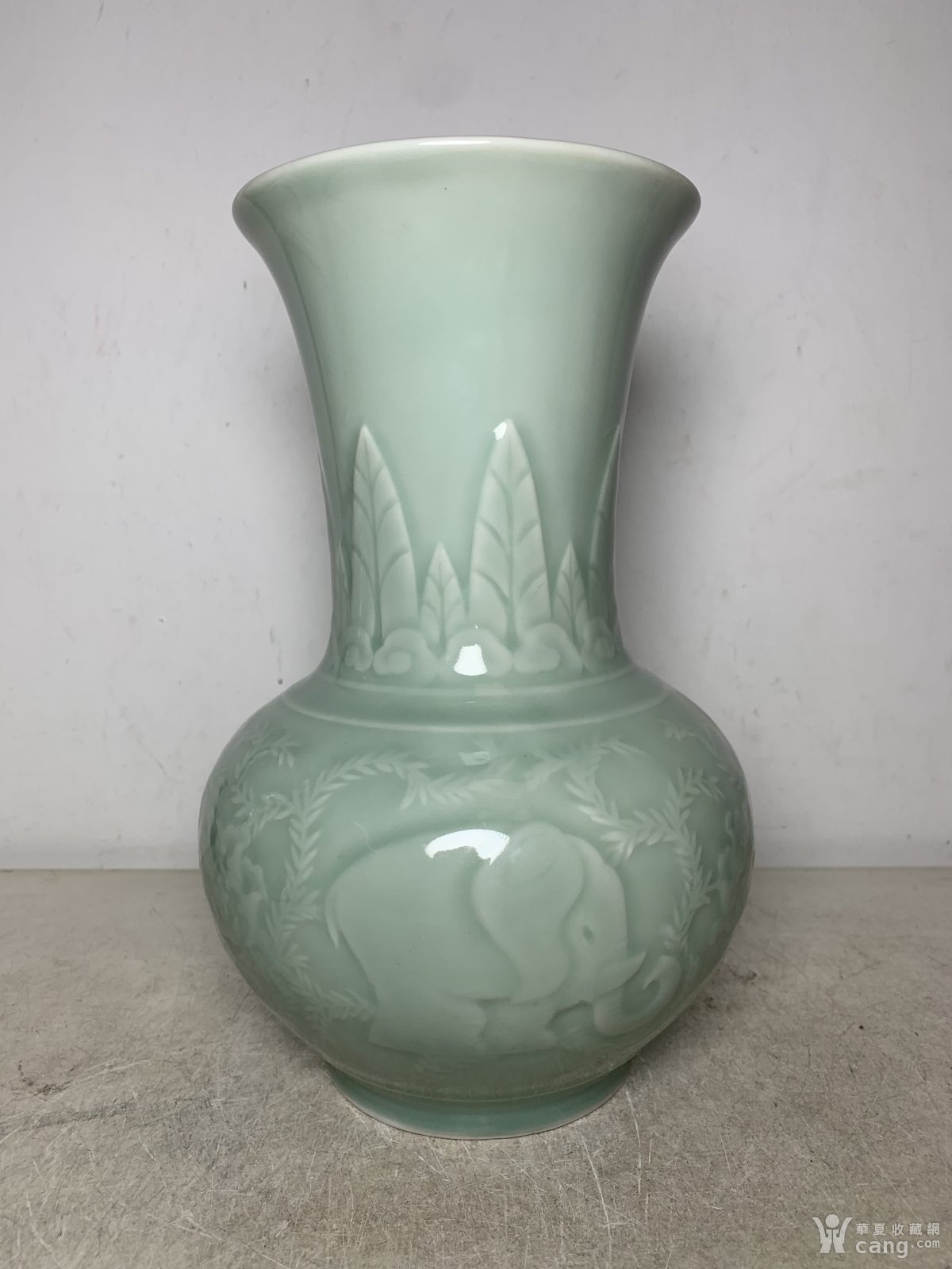 七十年代宜兴青瓷堆白大象芭蕉花卉赏瓶