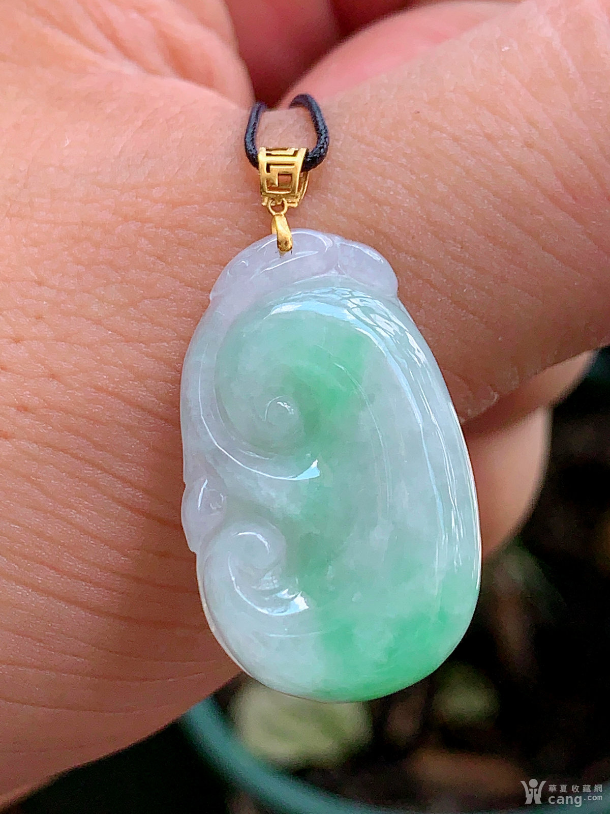 缅甸天然翡翠A货18k金扣冰透飘花如意吊坠