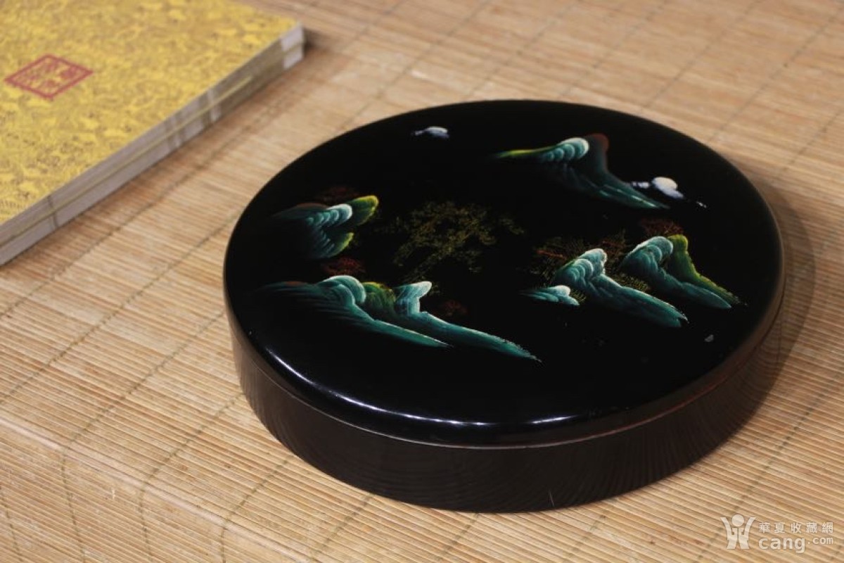 大漆山水纹捧盒 此捧盒圆润优美,表面通体黑大漆,黑盖彩绘青