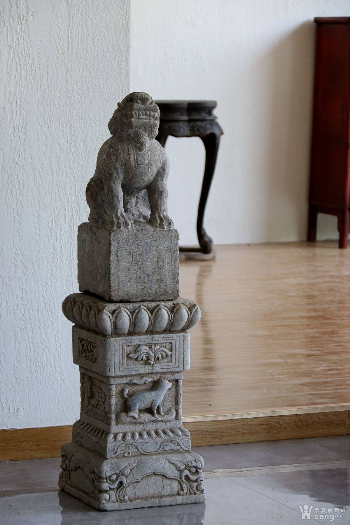 朝天一吼 呈蹲坐姿于石座之上,直立硕首健肢身,姿挺拔力感十