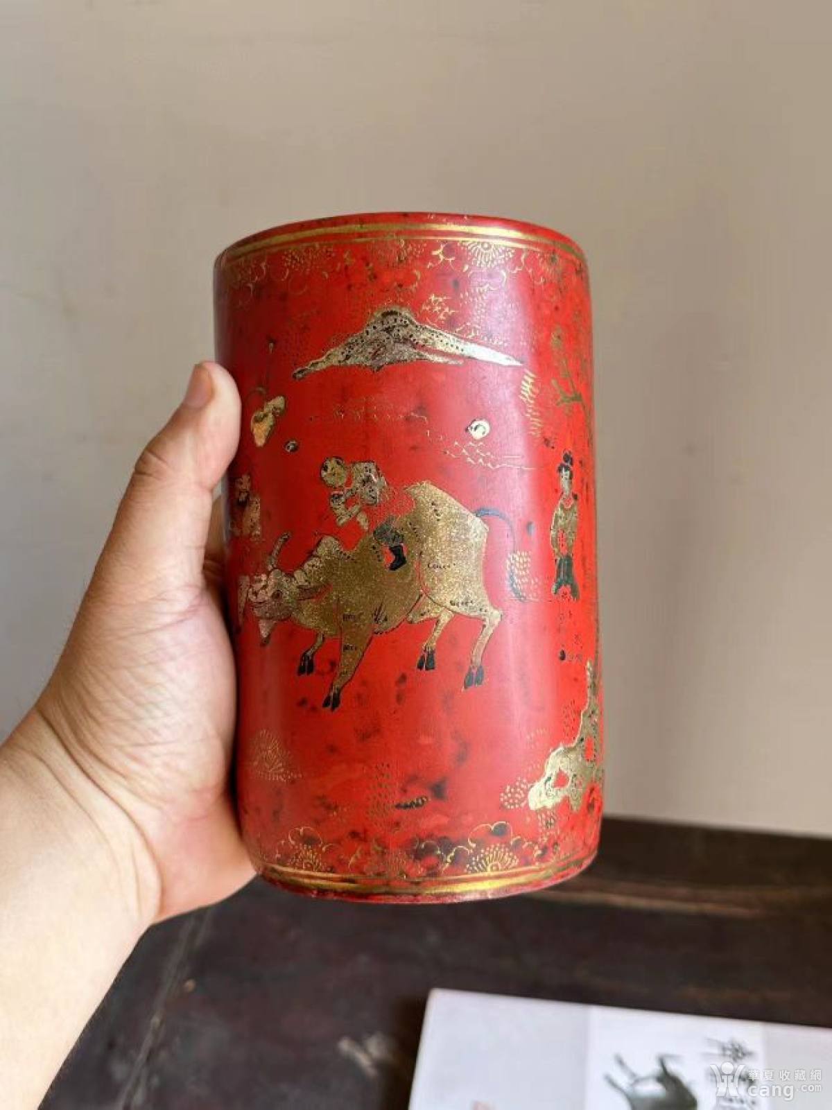 文房之朱红漆描金人物竹笔筒 清代,朱红漆描金/竹笔筒,16