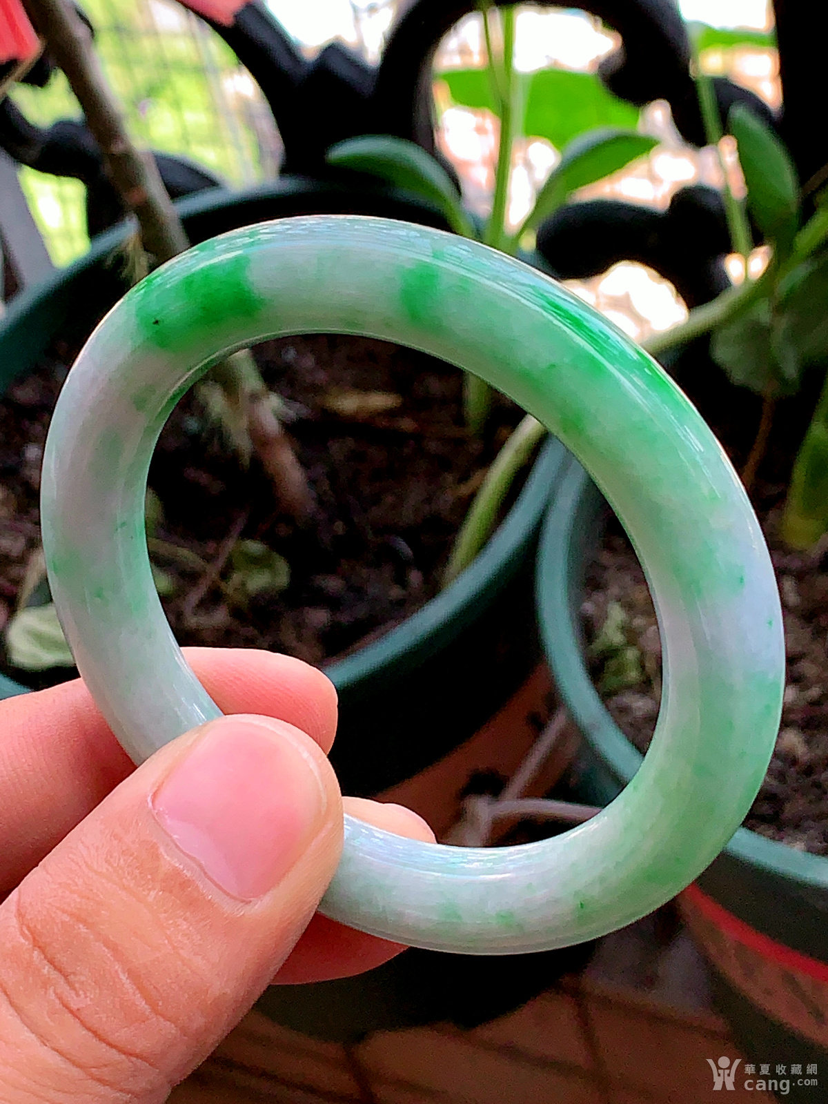 缅甸天然翡翠A货冰润飘花圆条手镯55.3圈口