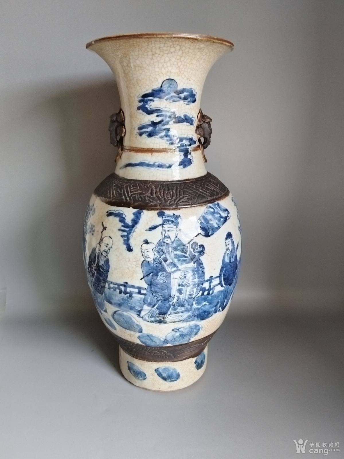 清代哥釉铁骨泥青花福禄寿三星报喜人物双辅首耳大瓶 全品