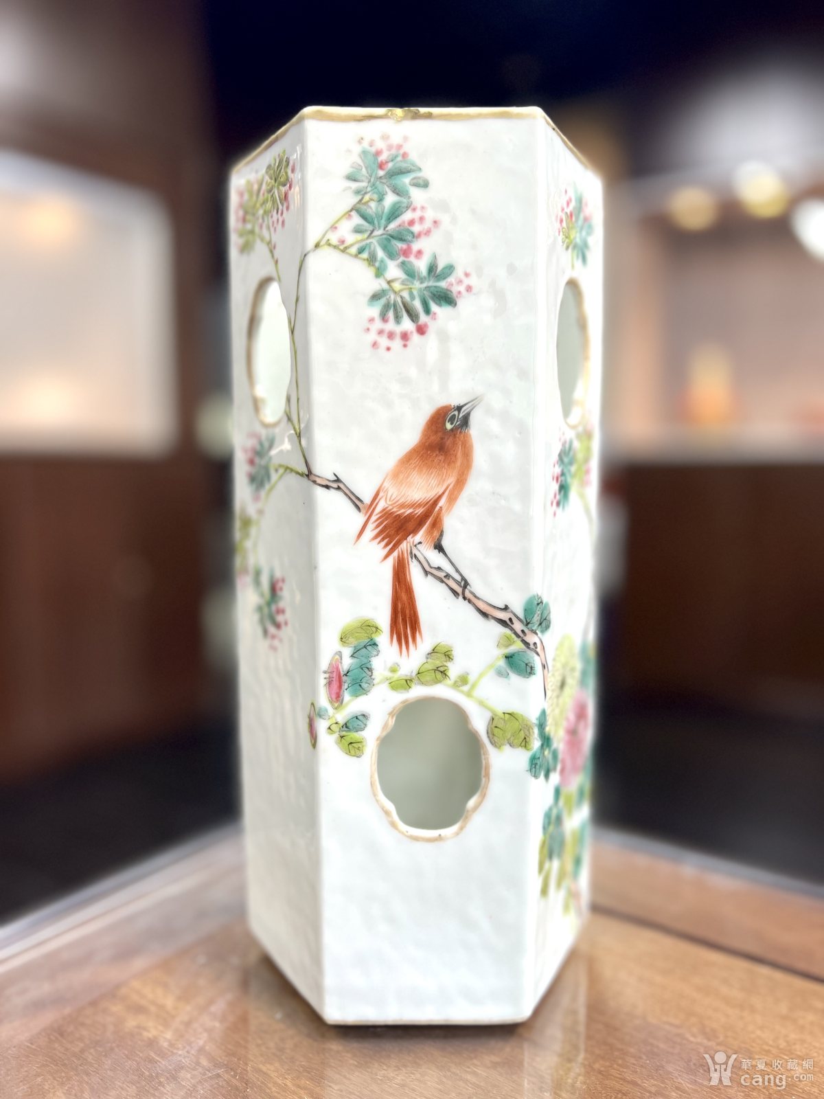 清光绪名家青山氏作浅绛花鸟诗文六方开窗帽筒
