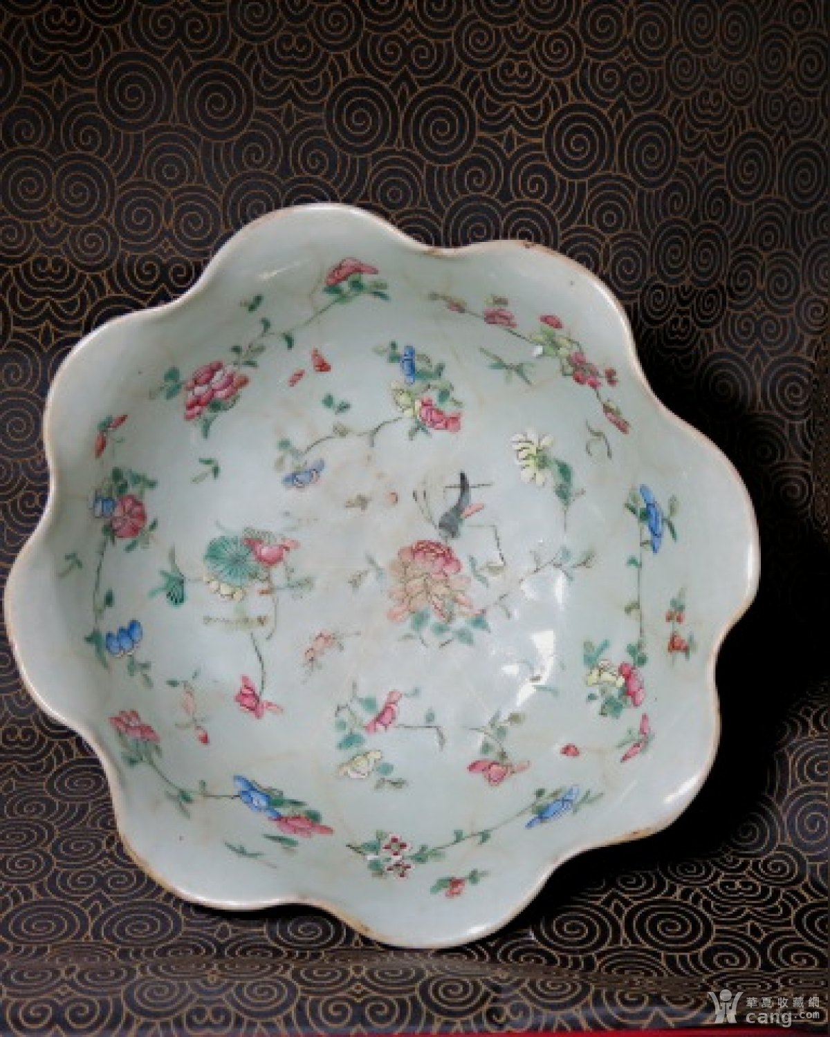 清代同治子孙满堂草虫粉彩瓜楞葵口高足盘