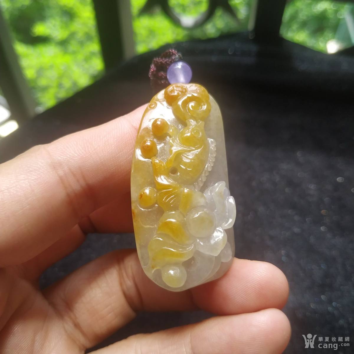 冰黄翡莲花鱼翡翠挂件。