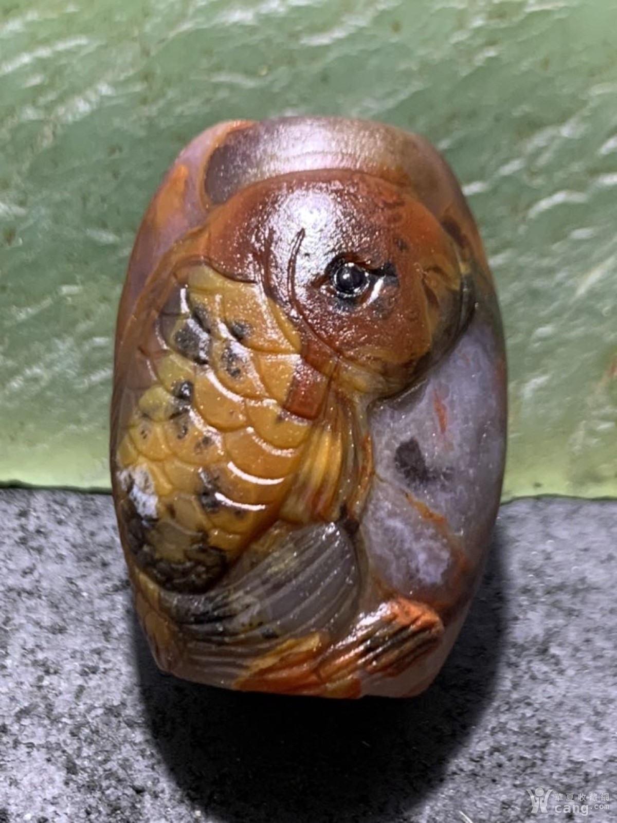 精美冰飘亚光战国红玛瑙手工巧雕胖鲤鱼随形桶珠一个,
