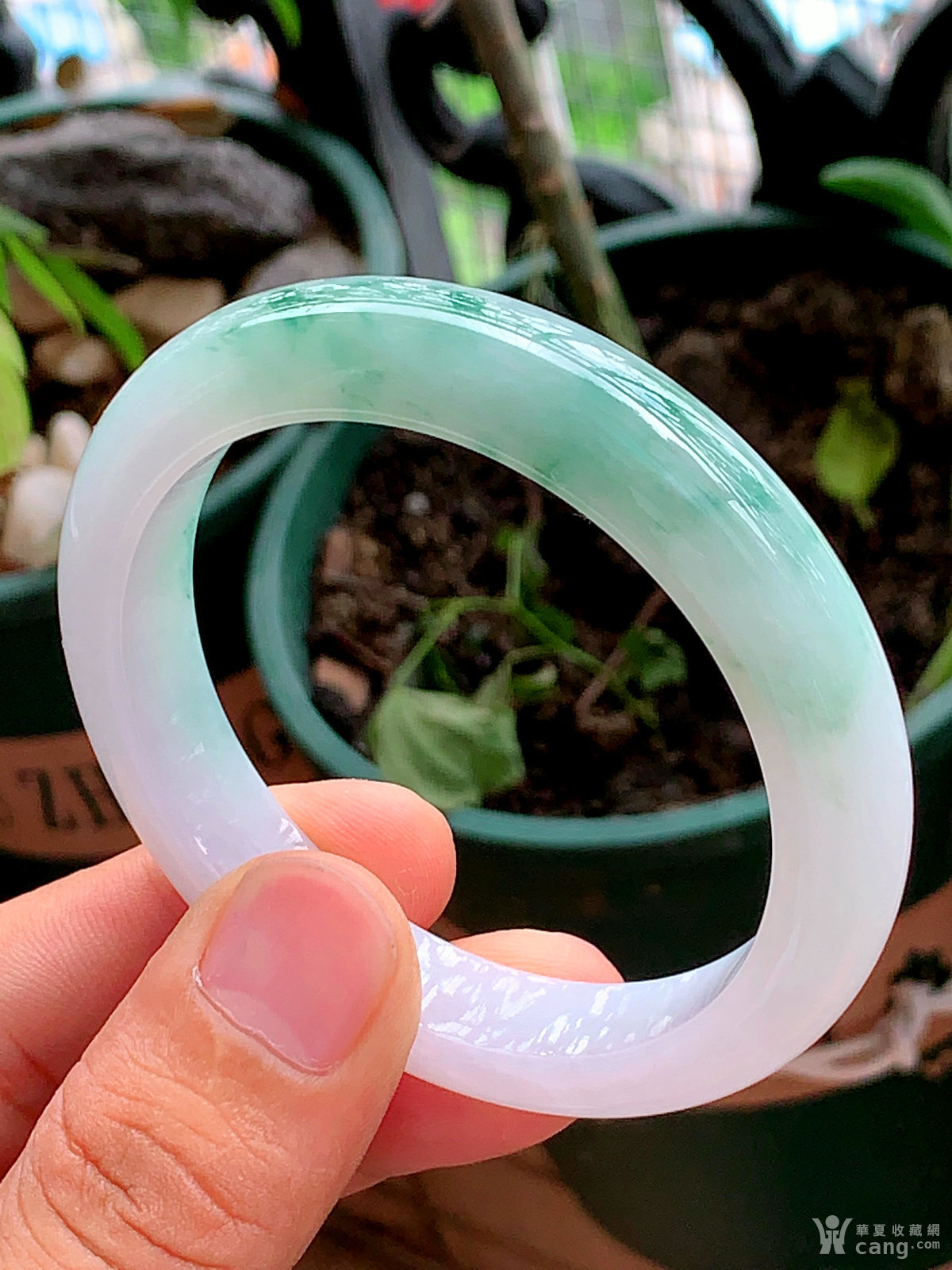 缅甸天然翡翠A货冰透水润飘花宽边手镯57.8圈口