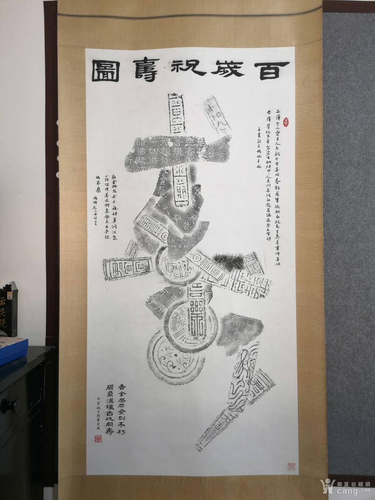 书画家杨旭,闫韦文拓片四尺整纸百岁祝寿图一幅,完整。