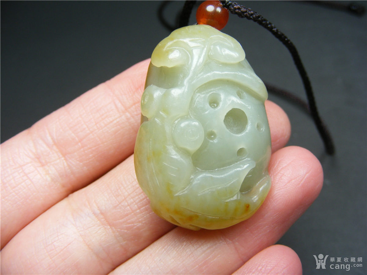 79 几十年的和田玉带金皮沁老雕法随型浮雕灵芝金鱼鱼篓大坠佩