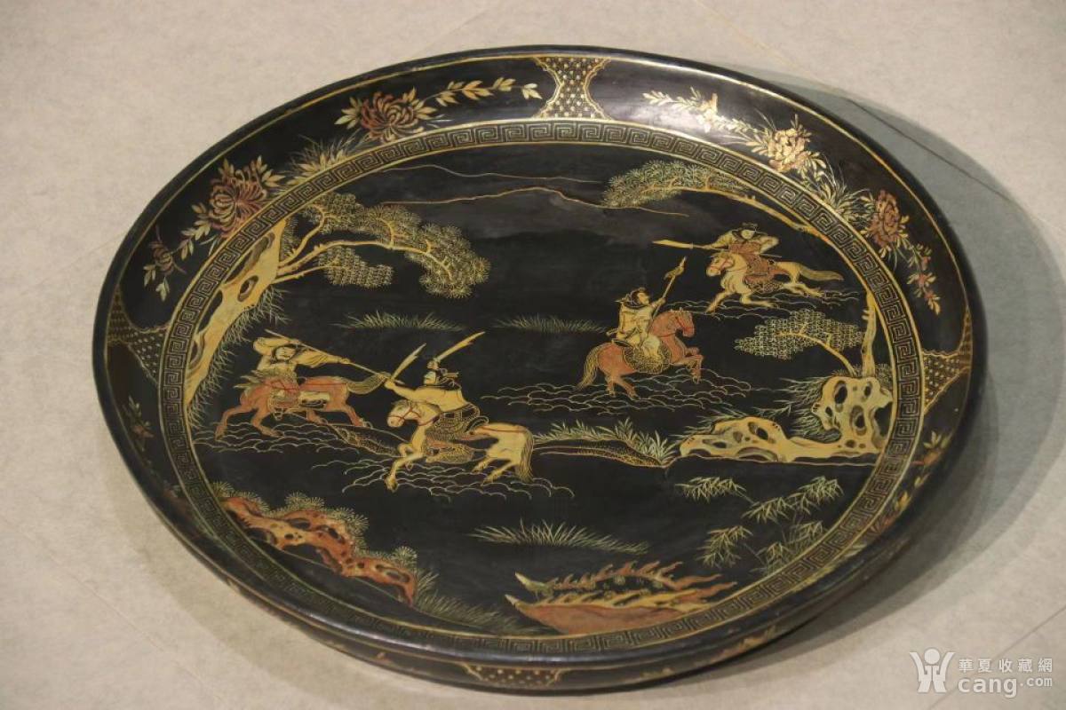 大漆描金人物•圆盘; 尺寸:直径51高7厘米。此文盘尺寸较大