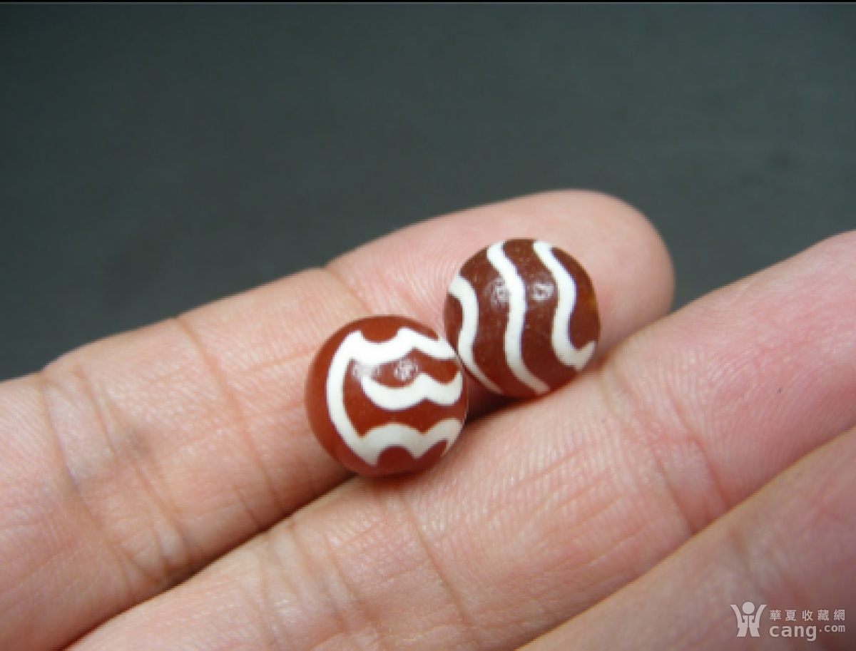 8 西亚几十年的镶蚀白彩红玛瑙菱形纹中型圆珠2件