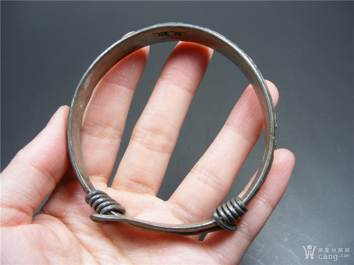 0419 几十年的合金镀银满工錾刻荷叶荷花“福字”大圆手镯