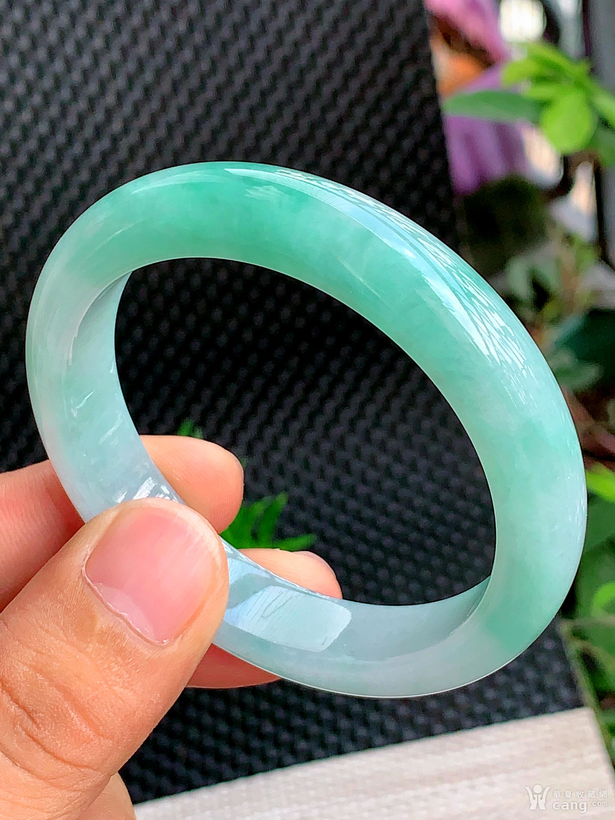 缅甸天然翡翠A货冰透水润飘花宽边手镯57.6圈口