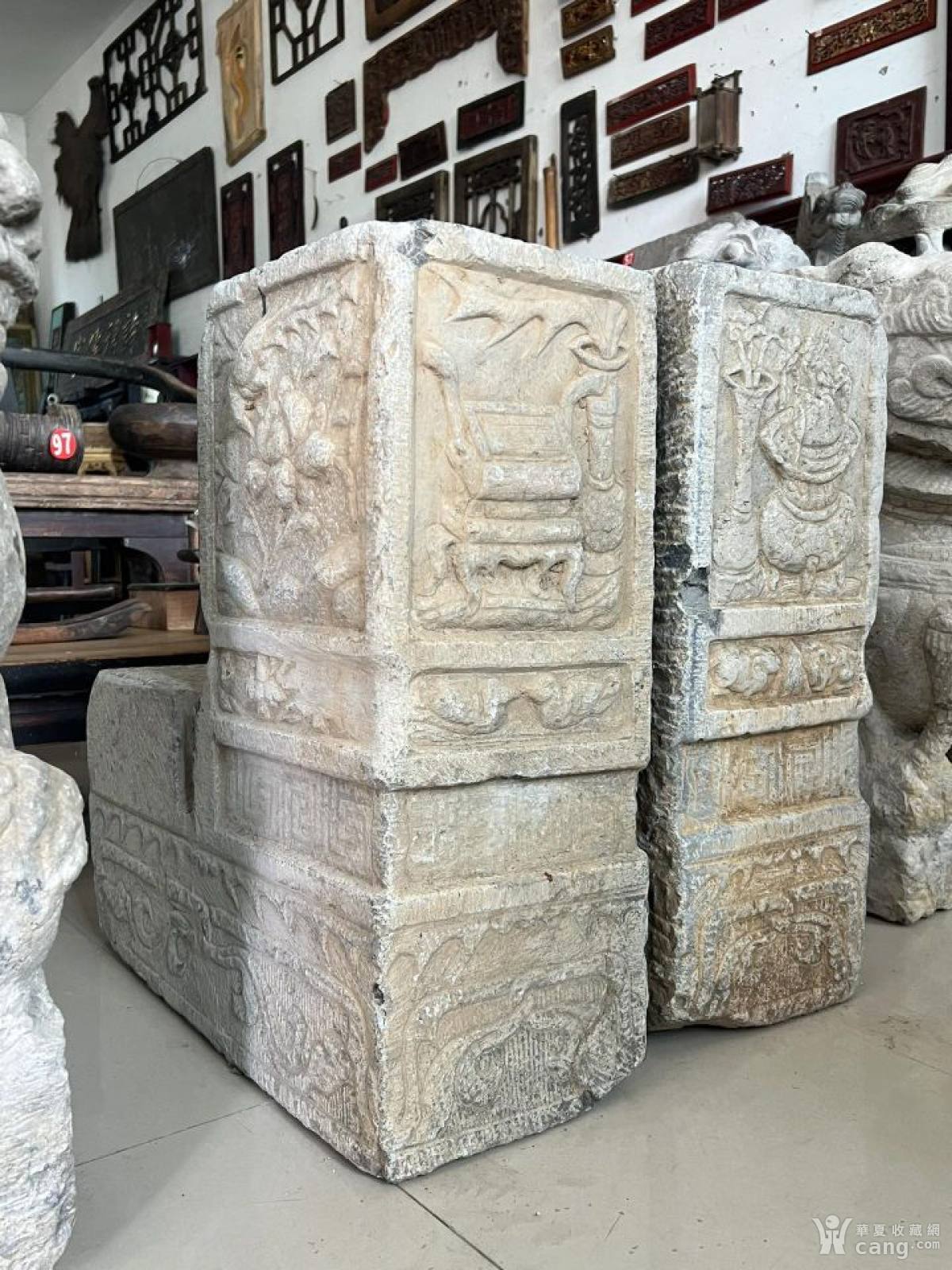 明代青石门墩一对,高浮雕,博古图! 尺寸:57×56×22厘