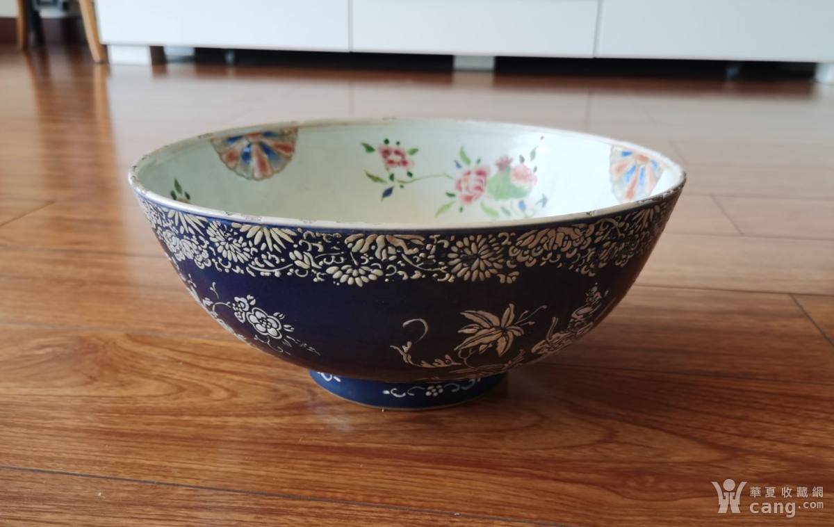 清中早期祭蓝地堆白内粉彩大碗