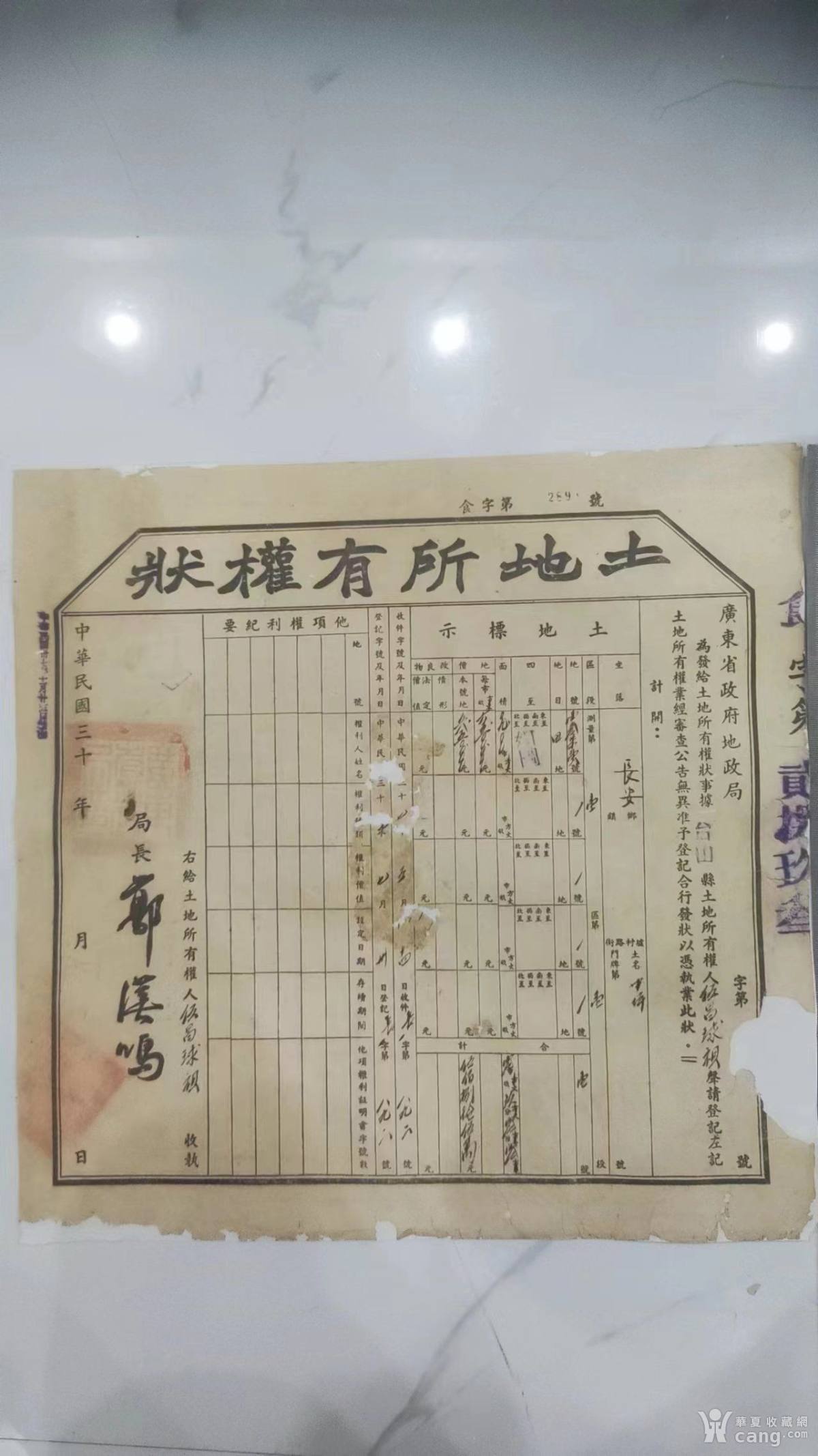1948年台山县食字第2893号(右上角及右骑缝)土地证一个
