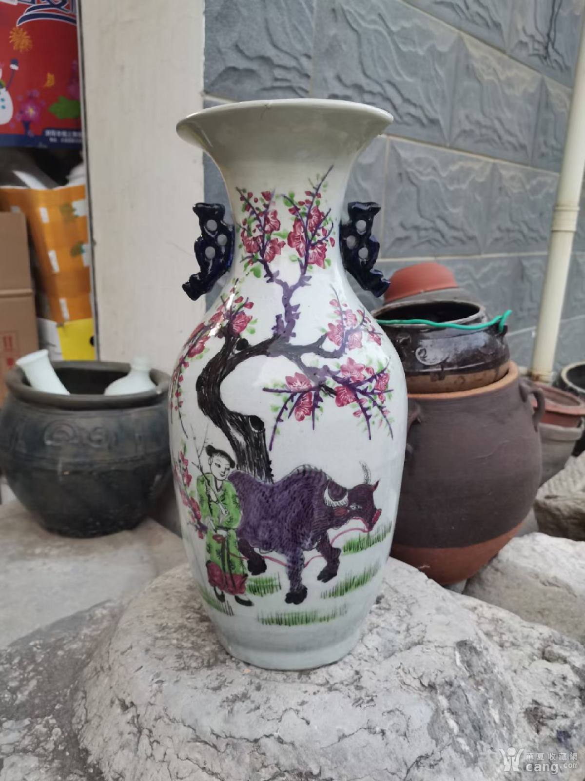 民国淄博窑红绿彩牧童骑牛纹瓶