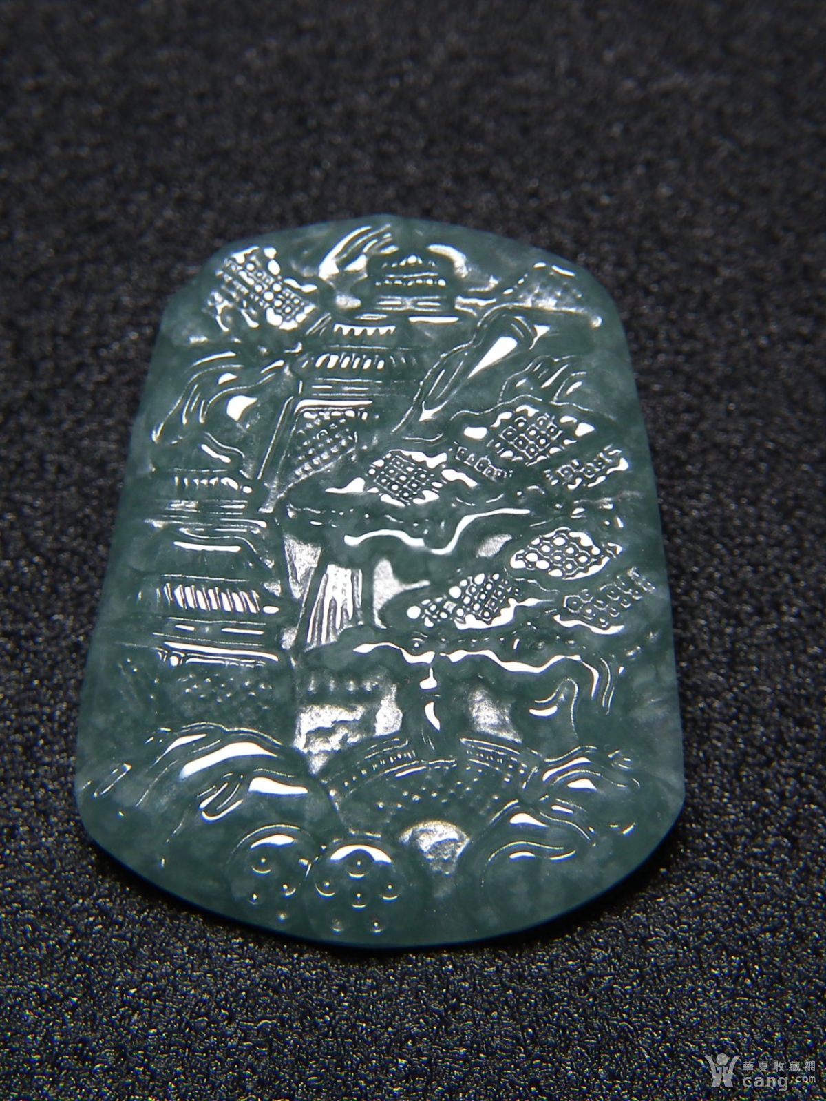 0108A货冰种满蓝水翡翠带棉单面工带孔浅浮雕庭院山峦大佩