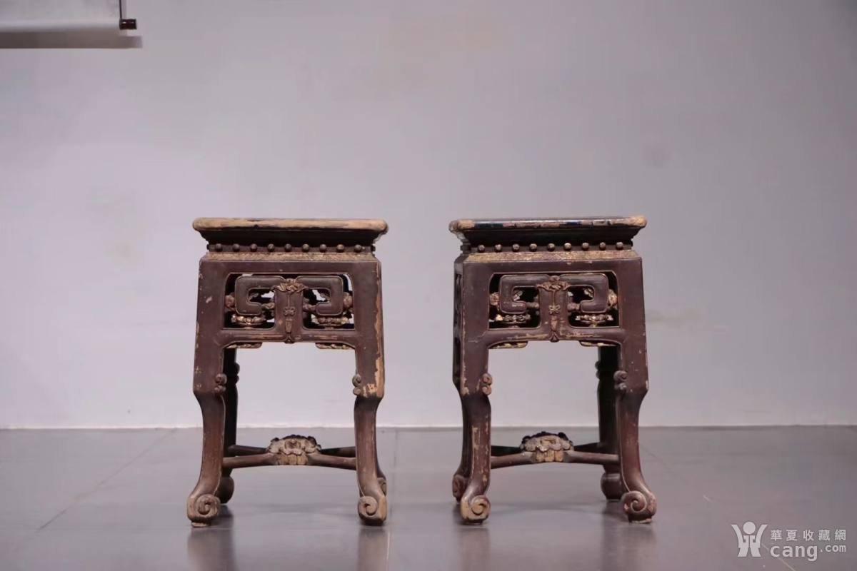 凳:面为黑漆描彩,下为弯腿卷云纹足,整器雕刻供桃,福寿吉庆,