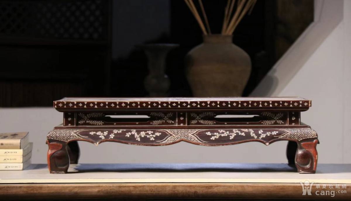 大漆嵌螺钿•案几 此案几面板有拦水线,束腰处四面带海棠形开