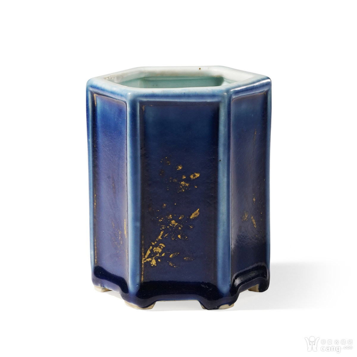 清雍正 霁蓝描金折枝花卉纹六方笔筒
