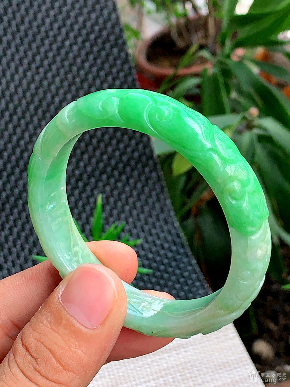 缅甸天然翡翠A货冰润飘花复古花雕宽边手镯57.6圈口