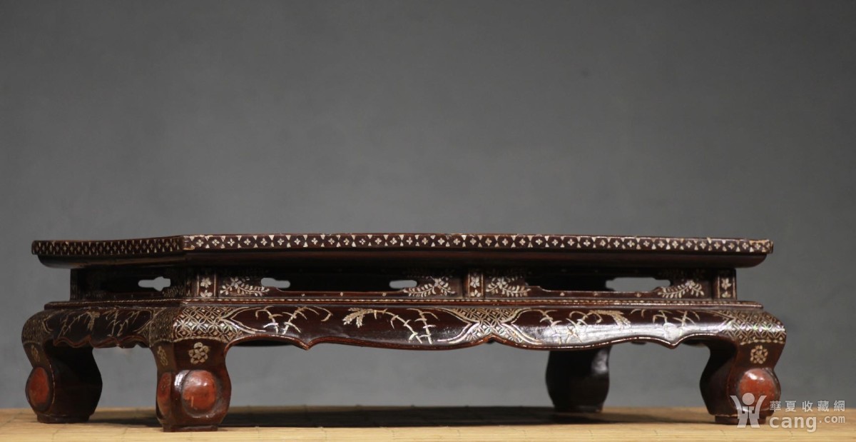 大漆嵌螺钿案几 此案几面板有拦水线,束腰处四面带海棠形开光
