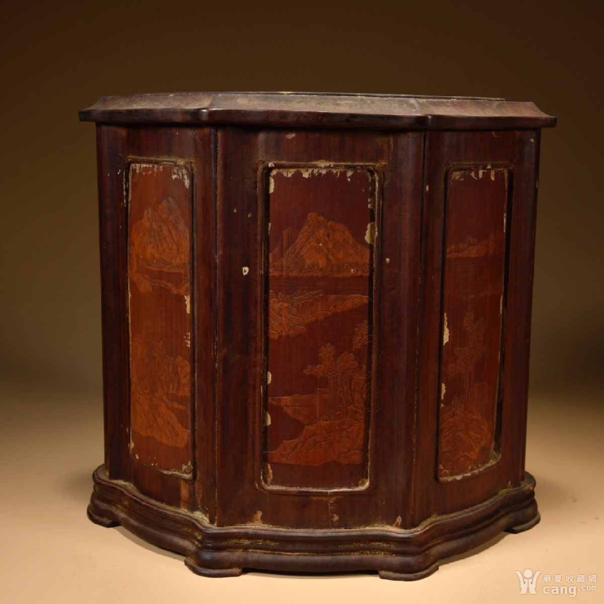 旧藏·酸枝镶竹黄留青山水笔筒。