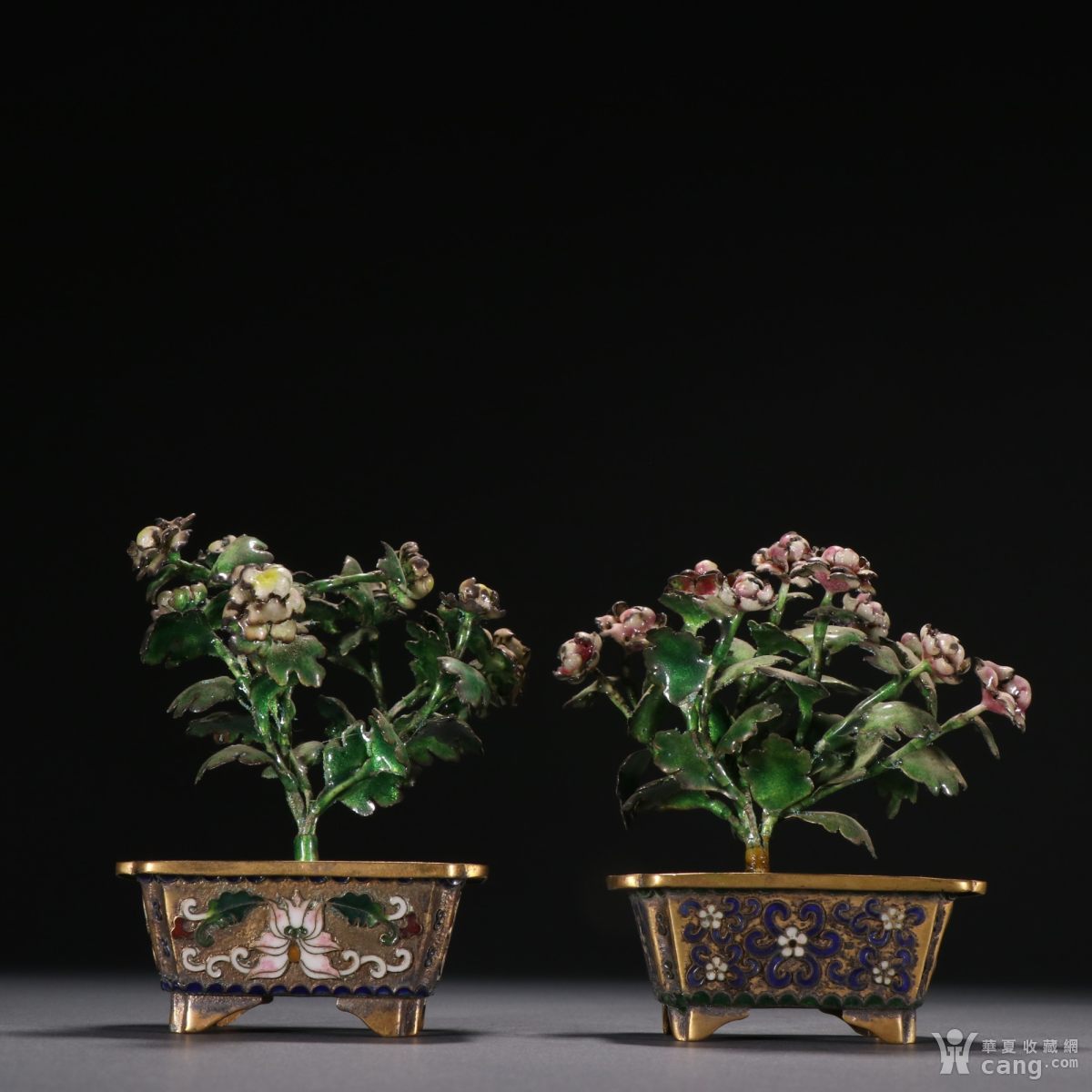 旧藏 铜鎏金烧蓝盆景一对。