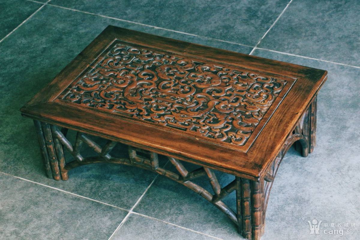 花梨木镂空竹节纹炕桌,茶桌,此桌面板雕刻草龙纹饰,下部为竹节