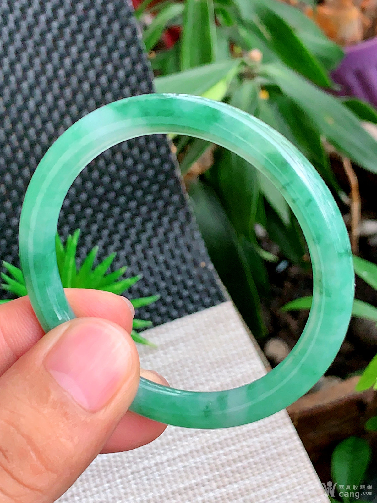 缅甸天然翡翠A货冰透水润飘花圆条手镯53.3圈口