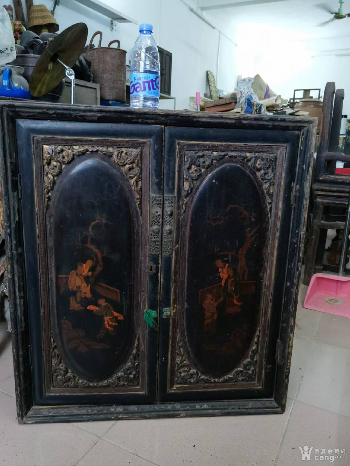 清代人物故事情节的漆画大书柜,左边画的是携琴访友,